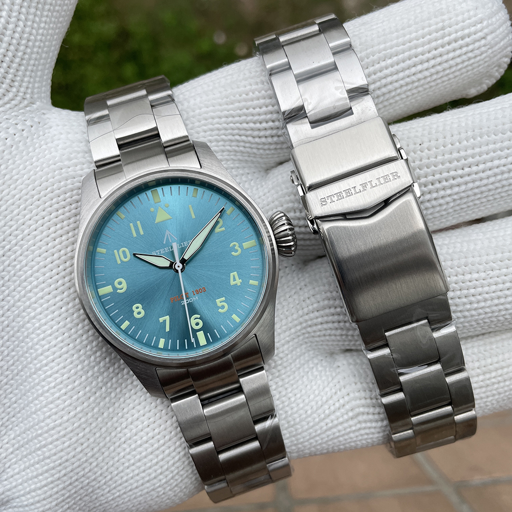 Project code: SF740Brand name: STEELFLIERMovement model: VH31Movement type: Quartz movementMovement features: 3 needles, sweep secondBattery model: SR920SWCase material: 316L stainless steelCase diameter: 39.00mm (without crown)Case length: 49.00mm (total length above and below)Case thickness: 12.00mm (including mirror, back cover)Case lug: 20.00mm (case and strap link)Watch weight: 52g (without strap)Weight: 65g (with leather strap) 138g (with steel strap)Watch strap material: Leather/stainless steelLuminous features: Swiss super luminousBottom cover type: Screw in solid bottom coverCrown type: Screw-in screw-lock crownCrown size: 7.00mm (diameter)Watch mirror features: Synthetic sapphireWatch mirror size: 33.50*1.80mm (diameter * thickness)Dial size: 34.00*33.60*33.00*0.40mm (wire hole * surface diameter * open surface * thickness)Pointer size: 9.00*14.50*14.50mm (length of hour hand * minute hand * second hand)Waterproof level: 200M waterproof/dive