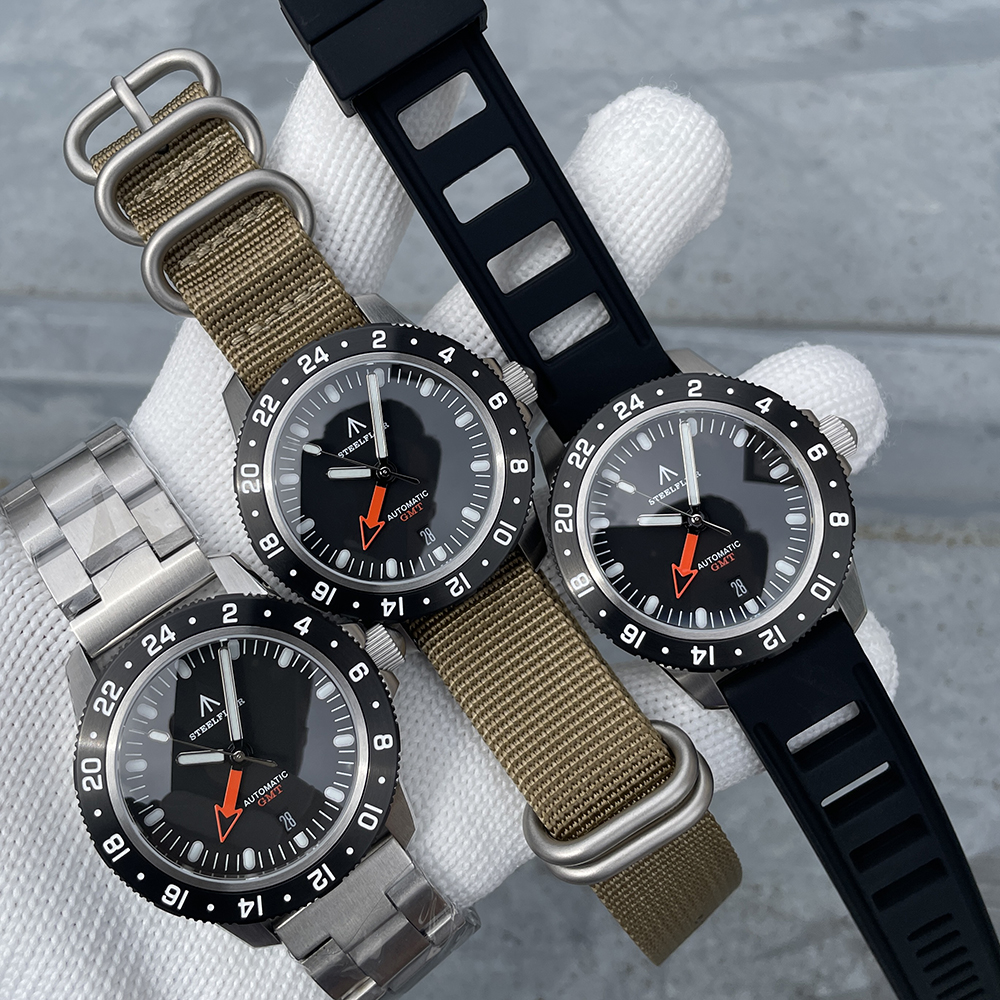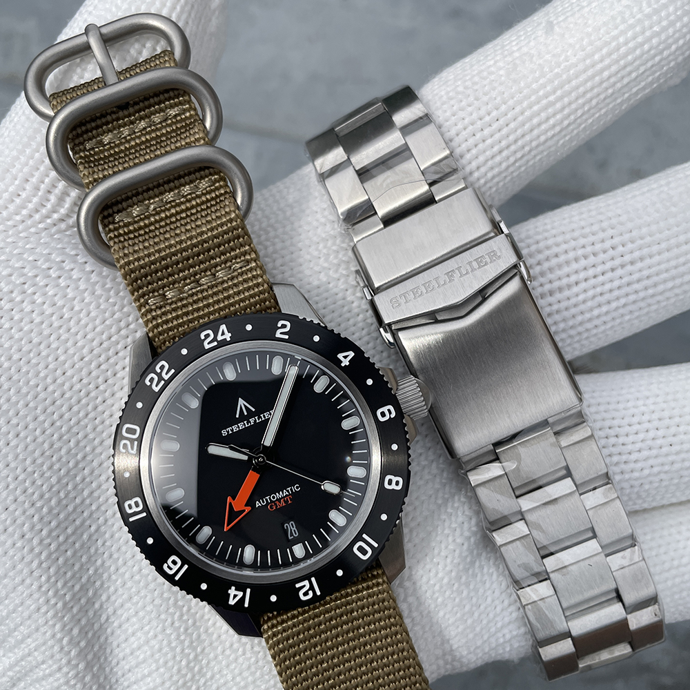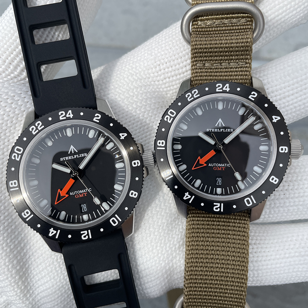 Movement features: Central GMT hand, 3 hands/calendar, frequency 21,600 times per hour (3Hz), stop-seconds mechanism, bidirectional automatic winding, 24 jewels, 41-hour power reserve.